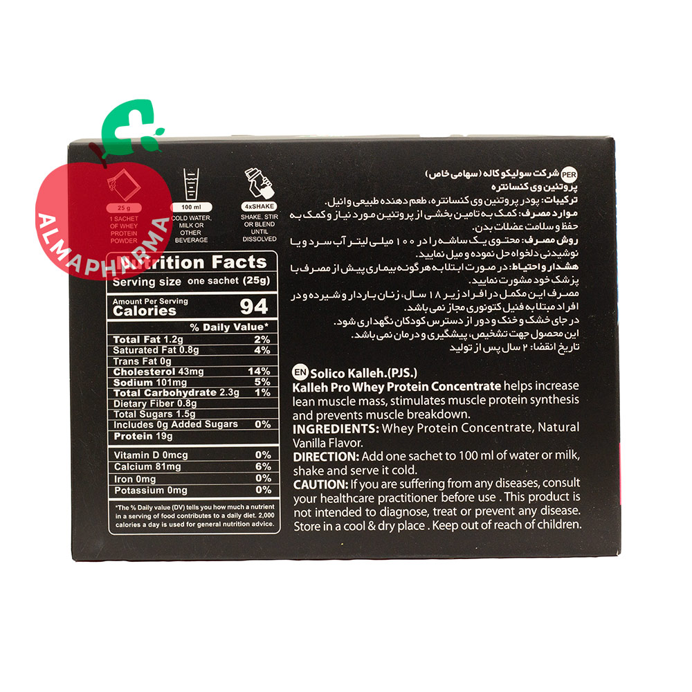 ساشه وی پروتئین %۱۰۰ کاله پرو با فرمولی متعادل از پروتئین وی کنسانتره (Whey Protein Concentrate) و اسیدهای آمینه ضروری، بهگونهای تهیه شده که بتواند انرژی و مواد مغذی لازم برای عضلهسازی، ریکاوری و حفظ سلامت بافتهای بدن را تأمین کند. هر ساشه ۲۵ گرمی از این محصول حاوی ۹۴ کیلوکالری انرژی، ۱۹ گرم پروتئین، ۱.۲ گرم چربی کل (Total Fat) و تنها ۲.۳ گرم کربوهیدرات است.