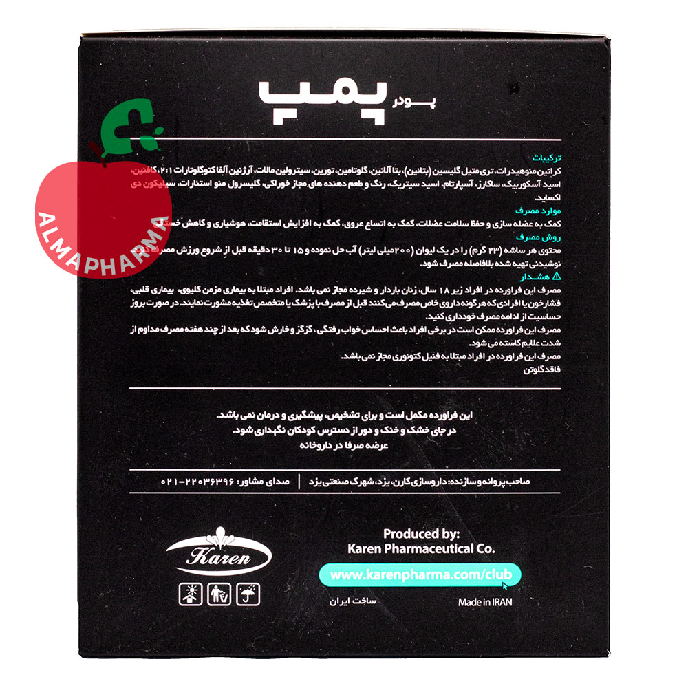 | میزان مصرف پیشنهادی | هر ساشه از پودر پمپ کارن (۲۳ گرم) را در حدود ۲۰۰ میلی لیتر(معادل یک لیوان) آب خنک کاملاً حل کرده و بلافاصله مصرف کنید. |