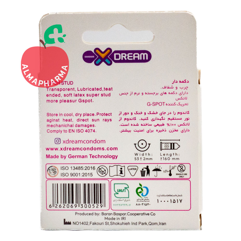 این محصول زناشویی در بستهبندی تک عددی و بهداشتی عرضه میشود و جنس آن از لاتکس طبیعی، شفاف و چرب است. روانکننده موجود روی بدنه باعث کاهش اصطکاک و افزایش راحتی در طول رابطه میشود. برند ایکس دریم که تحت نظر شرکت باران بسپار فعالیت دارد، با رعایت دقیق استانداردهای جهانی، محصولاتی باکیفیت و ایمن برای استفاده در روابط زناشویی تولید میکند.